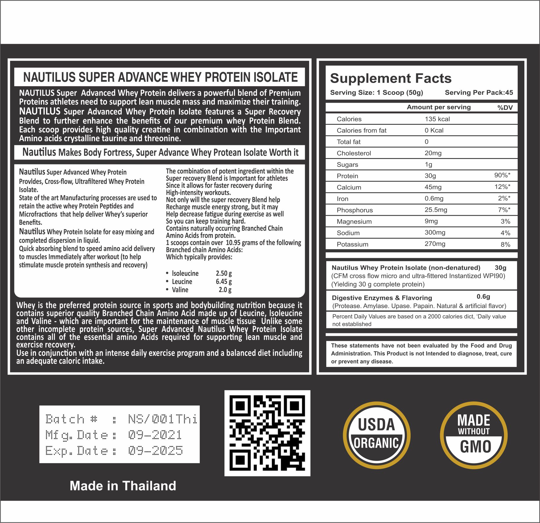 Whey is the preferred protein source in sports and bodybuilding nutrition because it contains superior quality Branched Chain Amino Acid made up of Leucine, Isoleucine and Valine – which are important for the maintenance of muscle tissue Unlike some other incomplete protein sources, Super Advanced Nautilus Whey Protein Isolate contains all of the essential Amino Acids required for supporting lean muscle and exercise recovery.